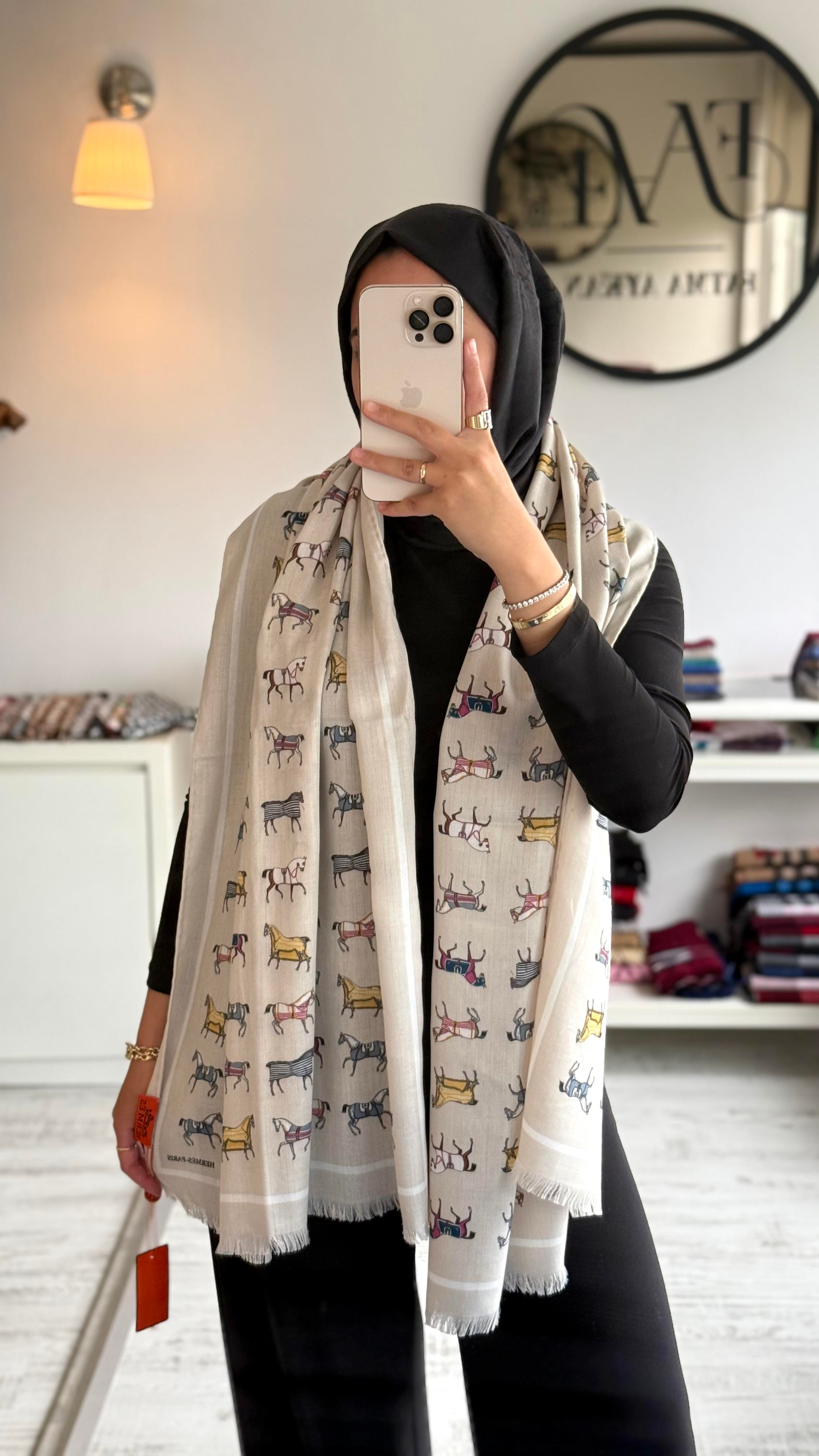 BEJ AT DESENLİ YÜN İPEK ŞAL