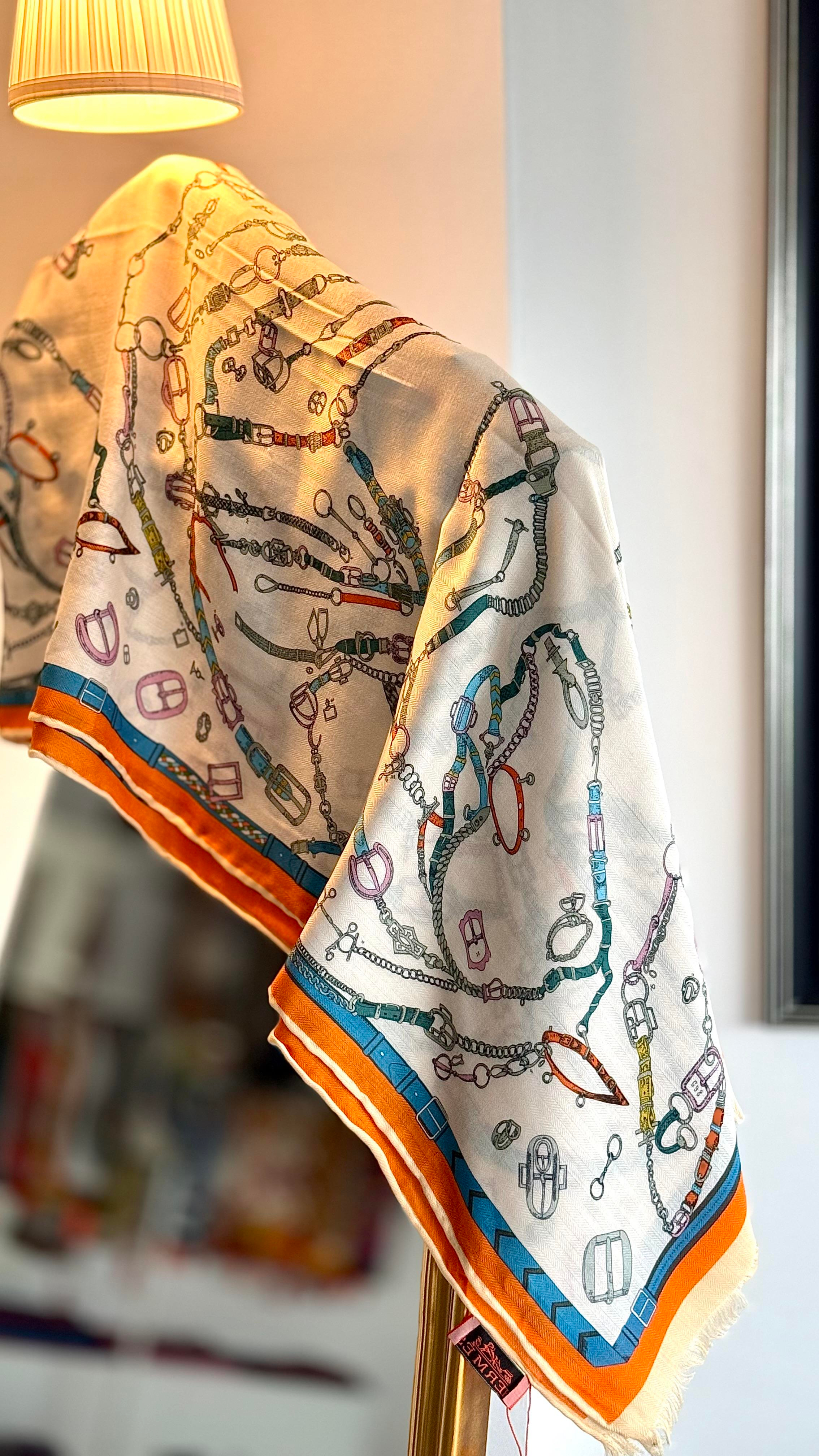EKRU / TURUNCU KEMER DESEN HRMS YÜN İPEK ŞAL